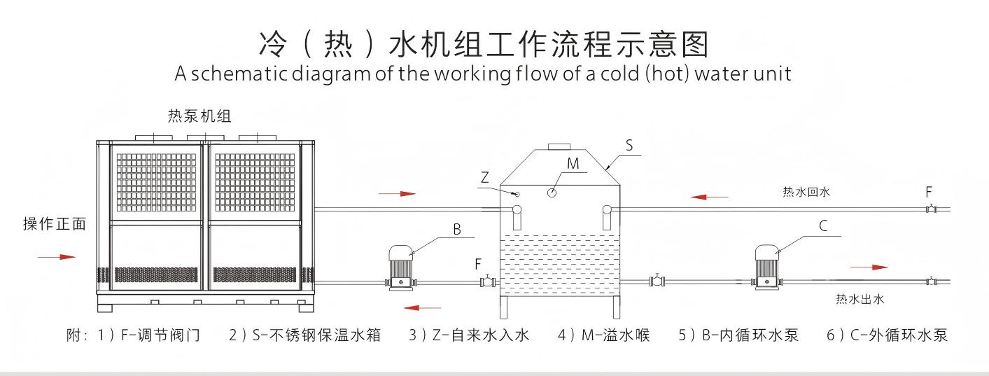6、为保证使用安全,机组内置漏电保护器、相位保护、过载保护、电流保护;系统安装了高、低压保护传感器,为防止缺水或循环水系统内部结冰,机组安装了流量开关和低液位保护装置。